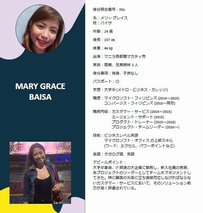 お見合い相手のデータファイルは次のサンプルのようにPDFでお送りいたします。氏名、年齢、身長、体重、出身地、家族構成、学歴、資格、職歴、技能、言語、アピールポイントが網羅されています。